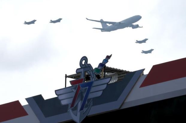 건군 77주년 국군의 날 기념행사가 1일 충남 계룡대에서 열렸다. KC-330 다목적공중급유수송기와 F-35A 전투기 편대가 공중분열을 하고 있다.