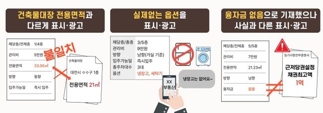 위반유형별로는 ‘부당한 표시·광고’가 166건(51.7%)으로 가장 많았다. 구체적으로는 전용면적을 실제보다 크게 표기하거나, 존재하지 않는 옵션(예: 냉장고)을 포함한 것으로 광고한 사례, 융자금이 없다고 광고했으나 실제로는 근저당권이 설정된 경우 등이 포함됐다. 이미 계약이 체결된 매물을 삭제하지 않고 계속 광고한 사례도 다수 확인됐다.