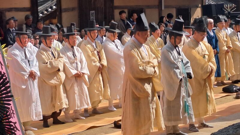 10월 25일 진성이씨 상계문중운영위원회가 개최한 경북 안동시 도산면 퇴계 종택 길사(吉祀)에서 제관들이 절을 하고있다.퇴계(退溪) 이황(李滉)의 17세손 이치억(李致億) 공주대 교수가 25일 퇴계 종손(宗孫)으로 공식 승계됐다.