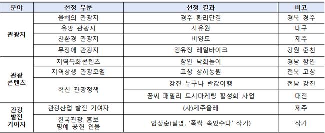 관광발전 기여자 부문에서는 (사)제주올레가 사라진 옛길을 되살려 걷기 여행 문화를 확산시키고 제주 관광 브랜드 가치를 높인 점이 인정됐다. 한국관광 홍보 명예 공헌인물로는 드라마 《폭싹 속았수다》의 작가 임상춘이 선정됐다. 작품 배경이 된 지역 곳곳이 촬영지로 주목받으며 관광 활성화로 이어진 공로다.