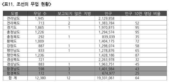 이 표를 분석하면 1930년 당시 조선의 인구 10만 명당 무당의 숫자는 64명이다.