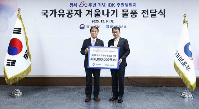 IBK기업은행(은행장 김성태)이 지난 9일 국가보훈부 서울지방보훈청에서 ‘광복 80주년 기념 IBK후원챌린지’에 따른 국가유공자 겨울나기 기부물품 4억원 전달식을 진행다고 밝혔다.