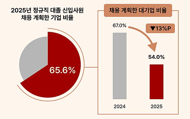 채용 계획을 확정한 기업의 규모별로 분석했을 때 △대기업 54.0% △중견기업 66.4% △중소기업 67.1%로 나타났다. 지난해 조사(2024년 △대기업 67.0% △중견기업 73.9% △중소기업 71.3%)보다 모든 기업에서 채용 확정 비율이 감소했다.