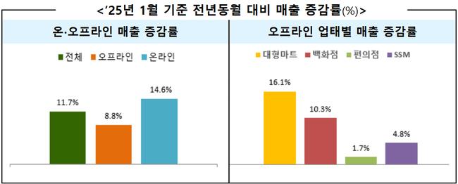 한편, 산업부 관계자는 "올해 1월은 설 명절의 영향으로 오프라인과 온라인 모두 높은 매출 신장세를 보였다"며 "소비자들의 변화하는 소비 트렌드와 수요를 빠르게 반영한 유통업체들의 마케팅 전략이 주요했다"고 분석했다.